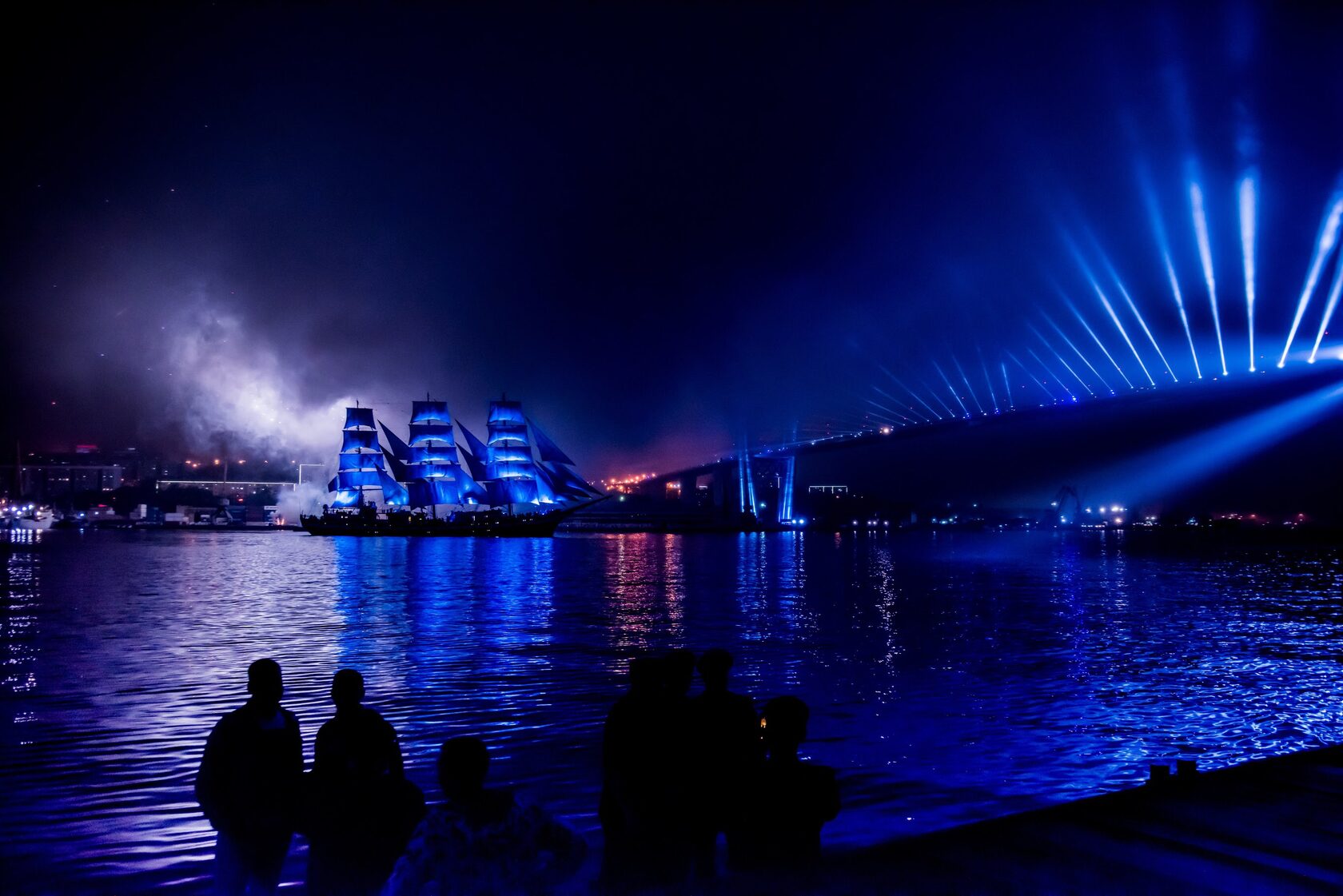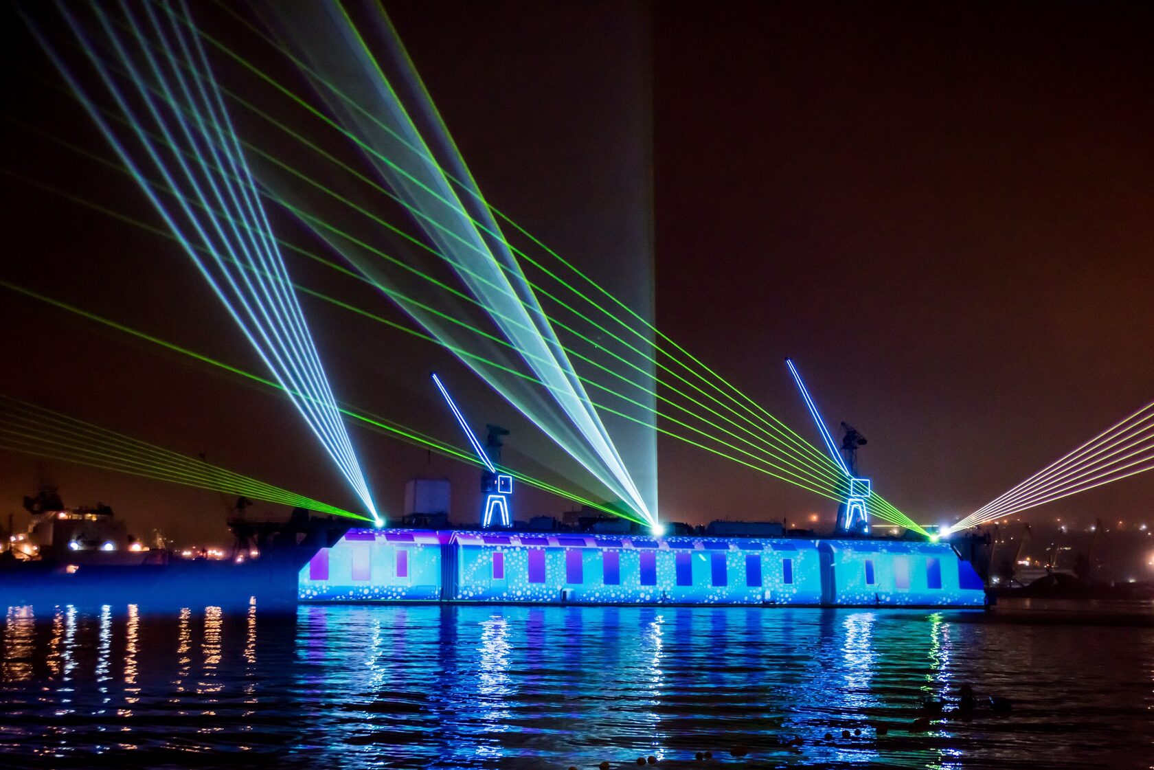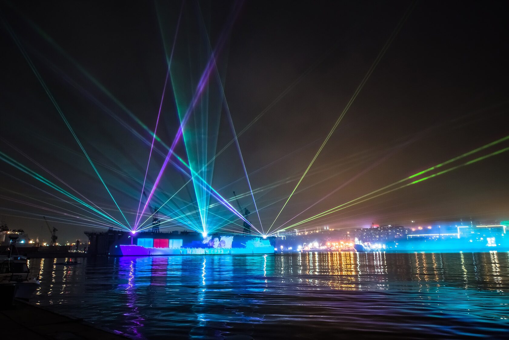 The production incorporated a wide array of cutting-edge technologies: projection mapping onto a 140-meter-long dock, water projections on three of the largest fan-shaped screens in Russia and Europe (D36m), laser displays, lighting effects on the bridge, traditional ship spotlights, pyrotechnics, a sound system with 25 linear arrays, and even cranes on the dock lifting a 6×6-meter laser cube with internal lighting. The challenge was considerable — seamlessly integrating all these elements into one cohesive spectacle under extreme conditions such as wind, fog, rain, and considerable distances.