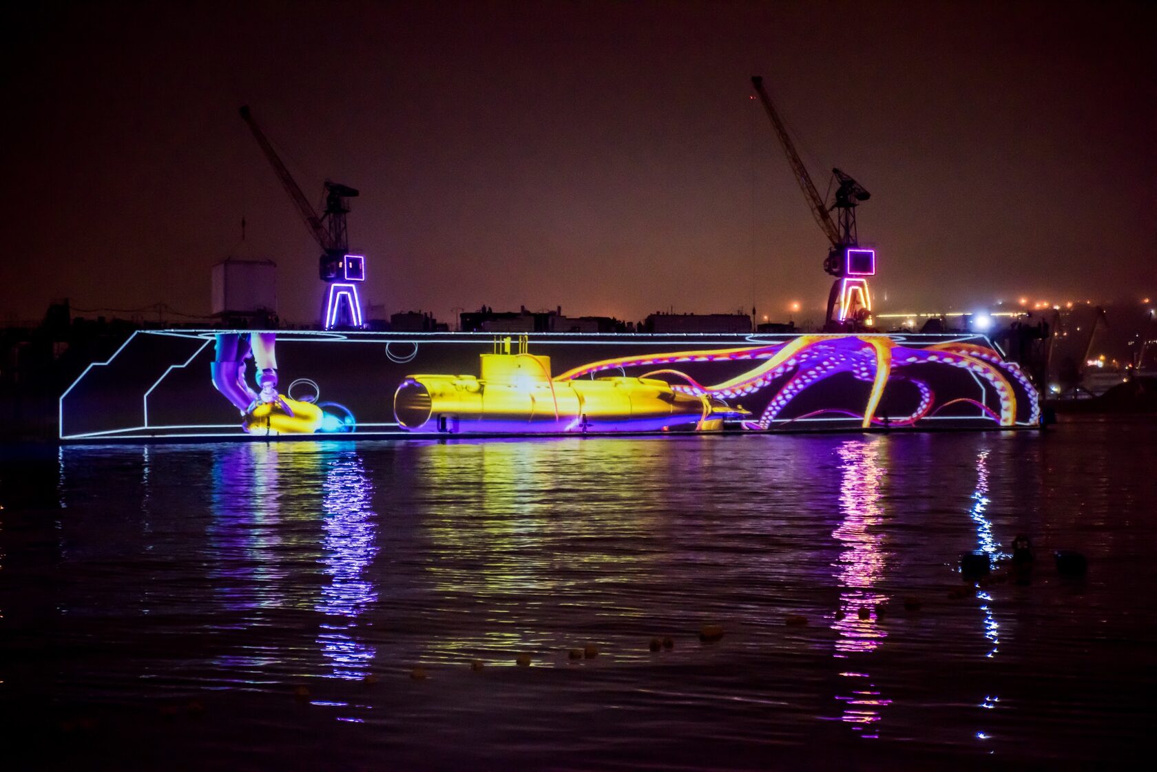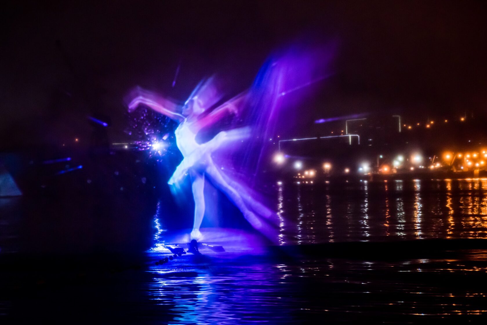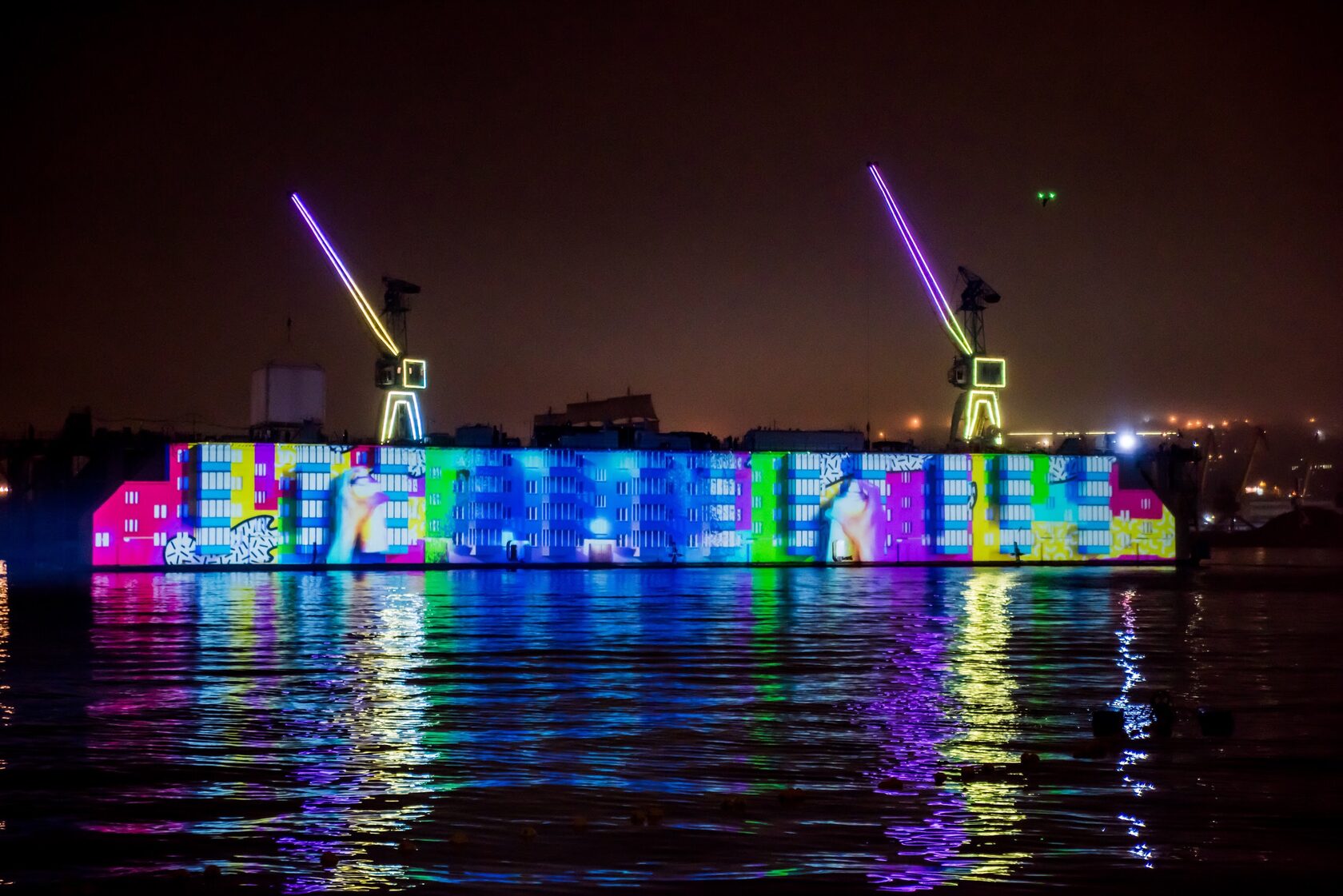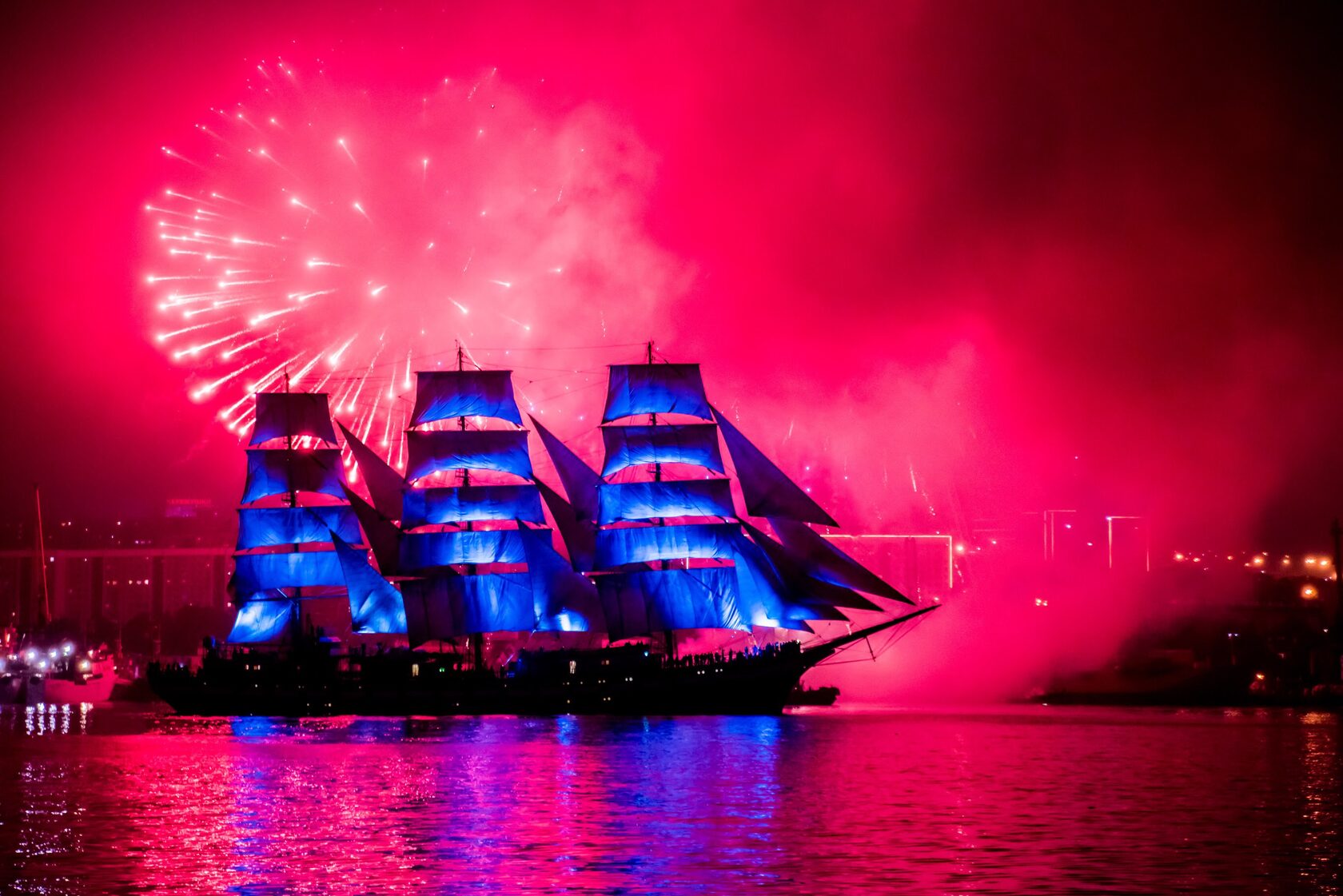 The production incorporated a wide array of cutting-edge technologies: projection mapping onto a 140-meter-long dock, water projections on three of the largest fan-shaped screens in Russia and Europe (D36m), laser displays, lighting effects on the bridge, traditional ship spotlights, pyrotechnics, a sound system with 25 linear arrays, and even cranes on the dock lifting a 6×6-meter laser cube with internal lighting. The challenge was considerable — seamlessly integrating all these elements into one cohesive spectacle under extreme conditions such as wind, fog, rain, and considerable distances.